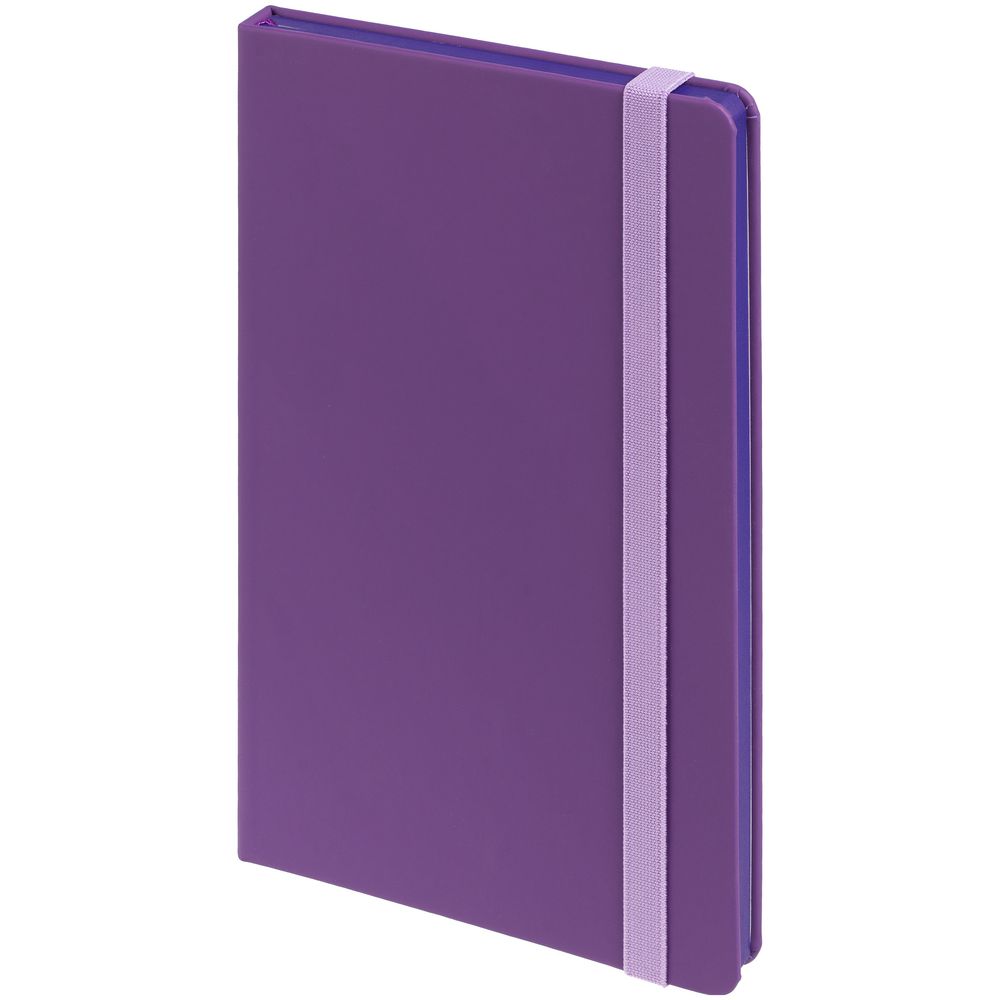 Блокнот в твердой обложке, выполнен из материала Soft Touch, фиолетовый UU, дополнен резинкой и ляссе в цвет обложки.