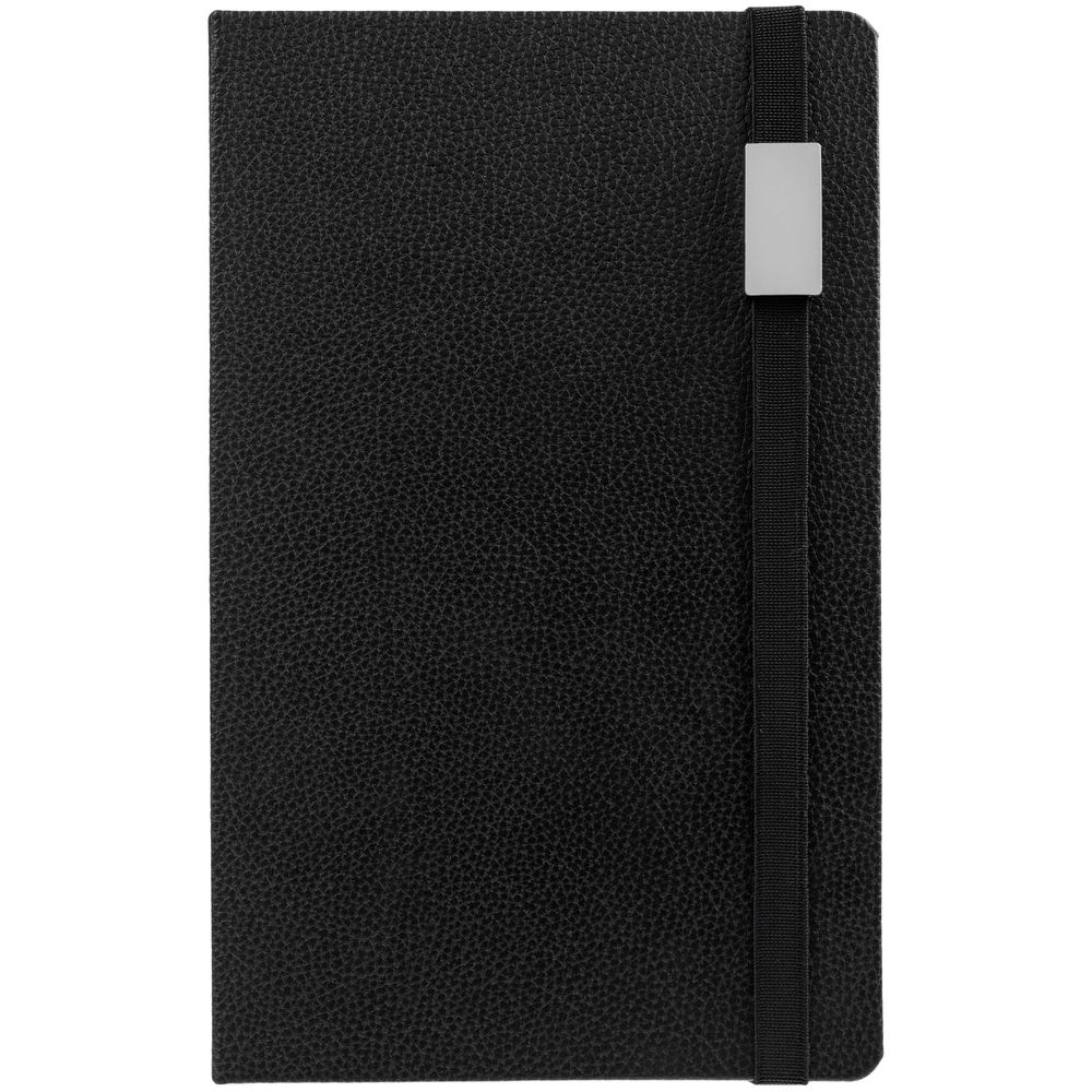 Ежедневник с твердой обложкой, выполнен из материала LaFite, черный АА, дополнен резинкой с металлическим прямоугольным шильдом и ляссе в цвет обложки.